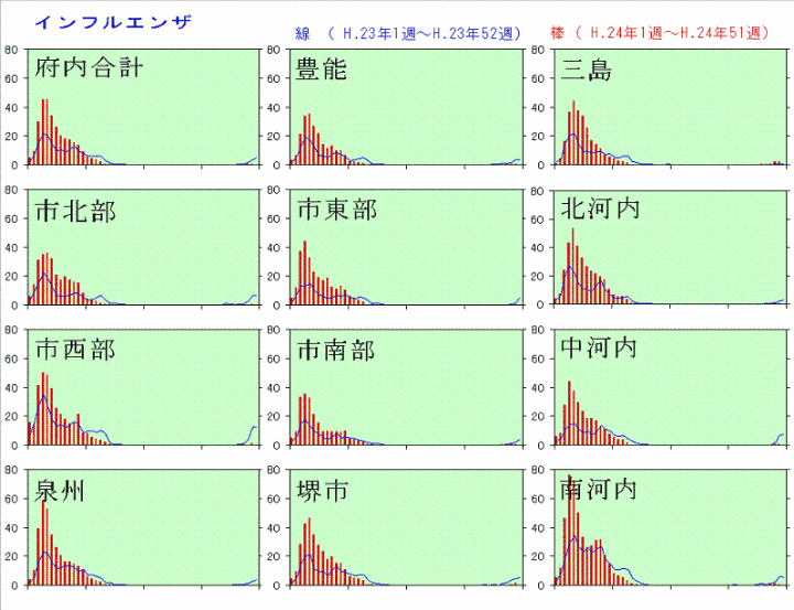 | 週 | 豊能 | 三島 | 北河内 | 中河内 | 南河内 | 堺市 | 泉州 | 大阪市北部 | 大阪市西部 | 大阪市東部 | 大阪市南部 | 府内計 |