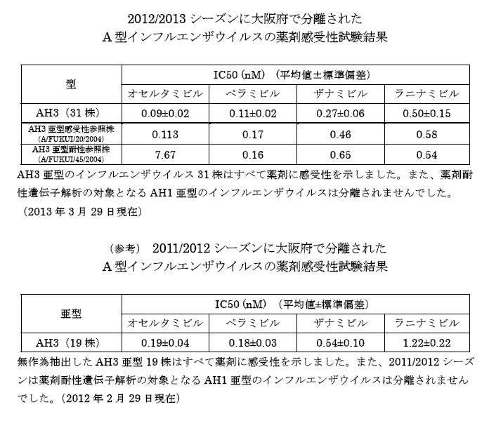 大阪府(*大阪市、堺市除く)で分離されたA型インフルエンザウイルスの薬剤感受性試験結果(3月29日現在)