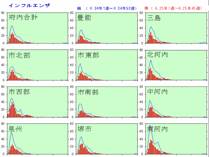 | 週 | 豊能 | 三島 | 北河内 | 中河内 | 南河内 | 堺市 | 泉州 | 大阪市北部 | 大阪市西部 | 大阪市東部 | 大阪市南部 | 府内計 |