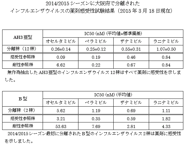 大阪府で分離されたインフルエンザウイルスの薬剤感受性試験結果(2015年3月18日現在)