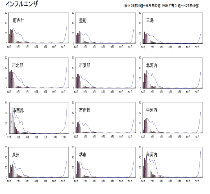 | 週 | 豊能 | 三島 | 北河内 | 中河内 | 南河内 | 堺市 | 泉州 | 大阪市北部 | 大阪市西部 | 大阪市東部 | 大阪市南部 | 府内計 |